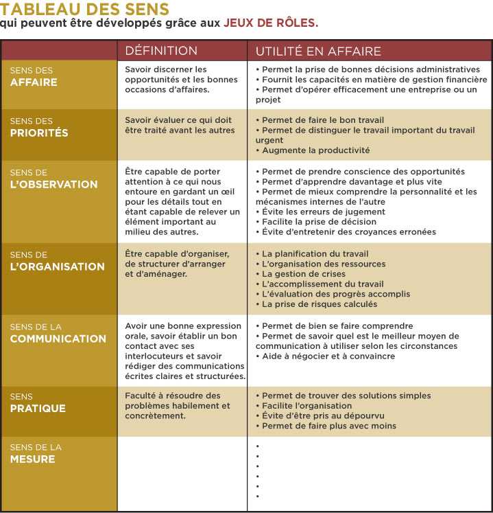 Les Jeux de rôles sont le prolongement essentiel aux enseignements de base de la première étape, les jeux de rôles font le pont entre la théorie et la réalité de tous les jours et préparent le gestionnaire à bien intégrer les méthodes et les outils qui lui auront été enseignés dans les programmes de formation.